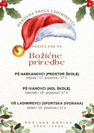Osnovna škola Ladimirevci i ravnatelj Damir Jakopiček srdačno Vas pozivaju na svečane priredbe povodom božićnih blagdana i završetka prvog polugodišta školske godine 2025./2026.
