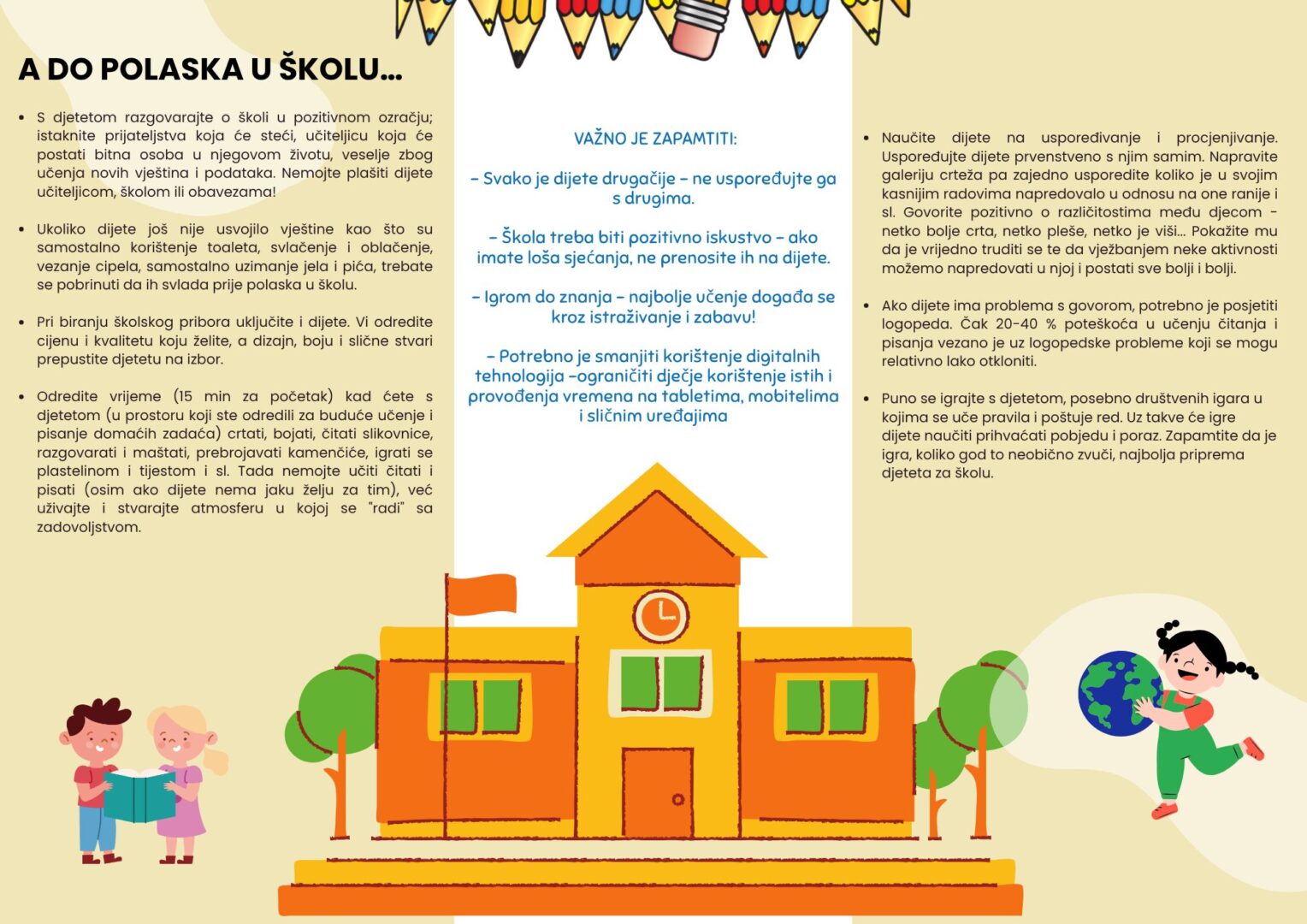 Uz prijavu za redovne upise u prvi razred osnovne škole, roditelji će moći podnijeti i zahtjev za prijevremeni upis u 1. razred osnovne škole kao i za privremeno oslobađanje od upisa u prvi razred osnovne škole, prema gore navedenim rokovima.